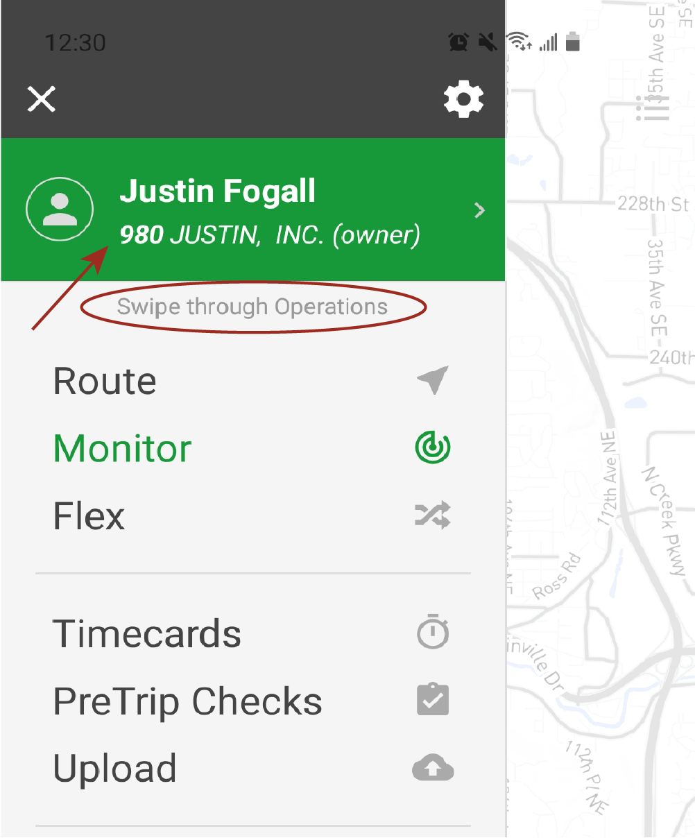 Swipe left or right (on the green menu) to swap to your next or previous entity in your 'operations list'. The current active operation is the one with the green background. Tap the operation to make it 'currently active'. All route data including your settings in the App switch to this operation. Only one operation can be currently active.